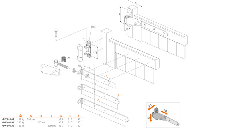 Vandalismebestendig 4D-scharnier voor houten poorten - Scharnierarm 300 mm voorgeboord met 3xØ9 mm