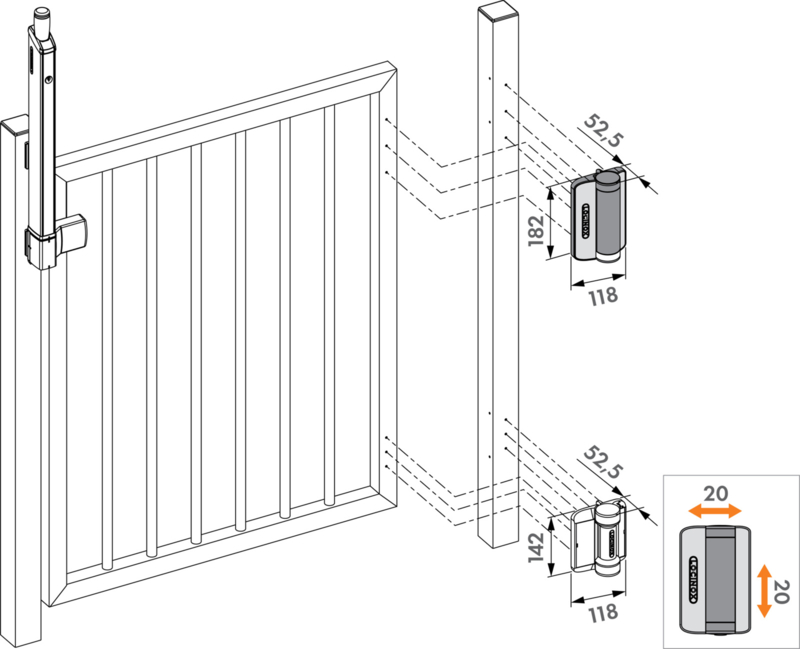Locinox Hydraulische poortsluiter en scharnier gemonteerd met zelfborende schroeven voor vierkante profielen Art. nr. P00010387