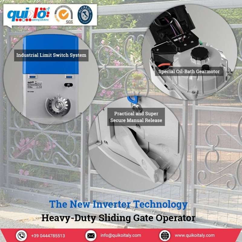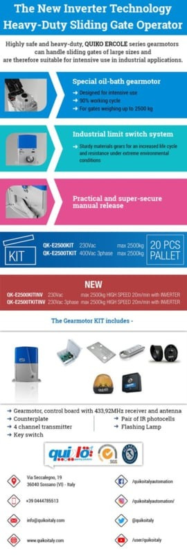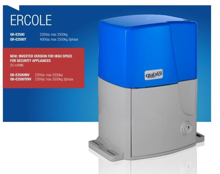 Eenvoudig te installeren, de schuifpoortaandrijvingen van de QUIKO ERCOLE-serie zijn de perfecte keuze om industriële en  prive poorten. voor zwaar gebruik (max. 2500 kg) te automatiseren. Met de handmatige ontgrendelingshendel aan de voorkant kan de gebruiker de poort handmatig bedienen in geval van nood, bijvoorbeeld tijdens stroomuitval.