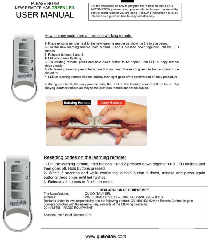 Quiko qk-m04 handzender design, rolling code . is een professionele handzender welke geschikt is voor alle 433 mhz roling code poortopeners en ontvangers. Door het kleine formaat en ergonomische vorm voelt de handzender goed aan en kan mede door de behuizing tegen een stootje en houd het binnendringen van stof en andere verontreinigingen tegen.