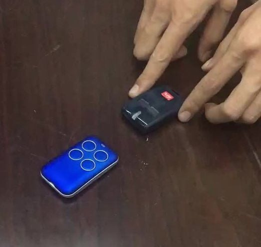 - Terwijl de FAAC / Genius-led knippert, plaatst u deze voor de universele afstandsbediening, op 2-3 cm afstand. Druk op de knop om te kopiëren totdat de led op afstand sneller begint te knipperen ter bevestiging van het kopiëren van de code.
