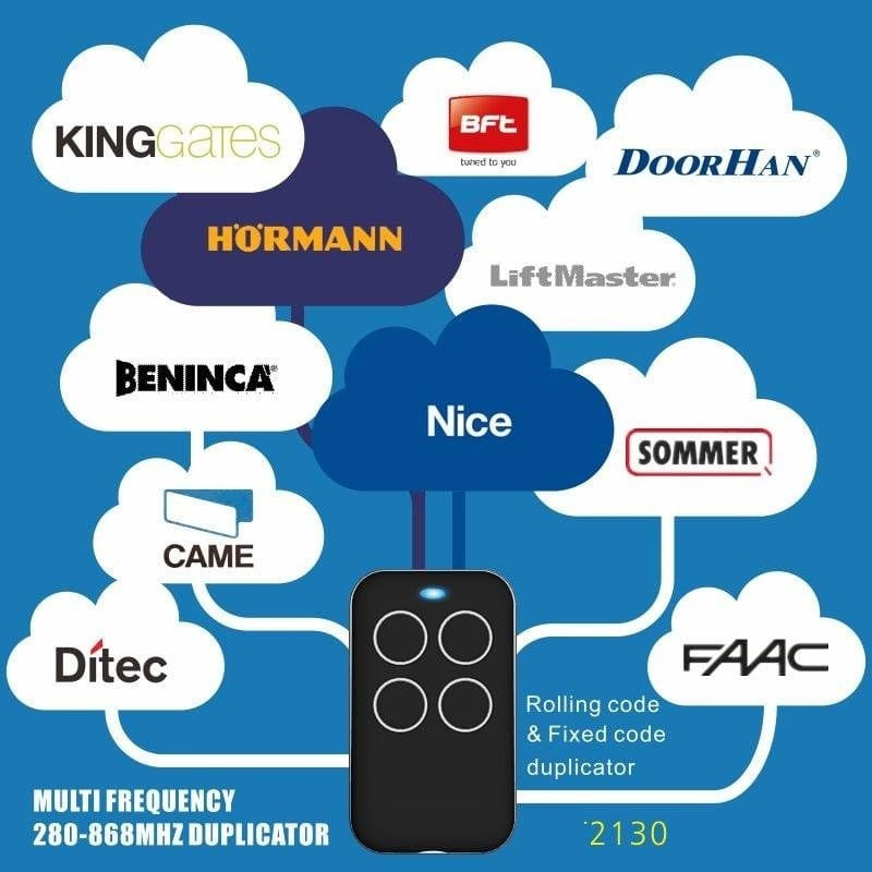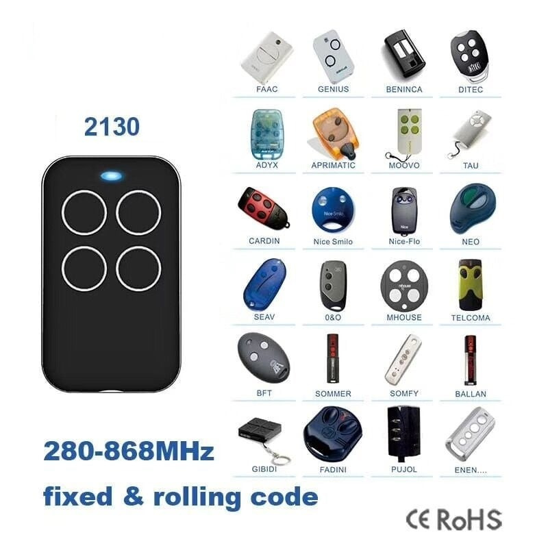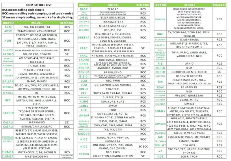 - Vervanging voor vaste en rolling code afstandsbedieningen met de frequentie van 280 tot 868 MHz.