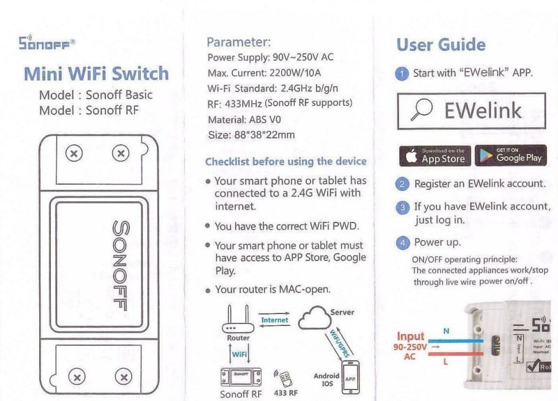 Een betaalbare oplossing voor huis / poort-automatisering (domotica). Deze switch is gebaseerd op de bekende ESP8266 en werkt over een WiFi verbinding waarmee apparaten via de cloud in en uit kunnen worden geschakeld. Door middel van de telefoon applicatie (iOS en Android) eWeLink kan deze WIFI switch overal ter wereld worden geschakeld, je hoeft niet eens thuis te zijn!