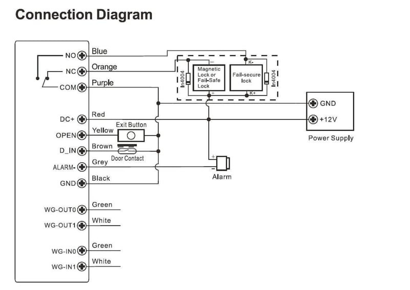 Wiring Connections | Relay Output, Exit Button, DOTL, Alarm, Wiegand Input, Wiegand Output |