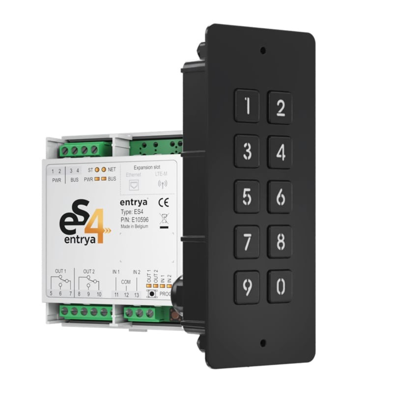 OverzichtEntraSYSTEM4 kit: ES4-controller en codeklavier KPFB-ES4 met verlicht en verwarmd toetsenbord (RVS 316). Aansluiting via 2-draads bus tot 100 m. Externe ES4-controller met 2 relais tegen manipulatie.