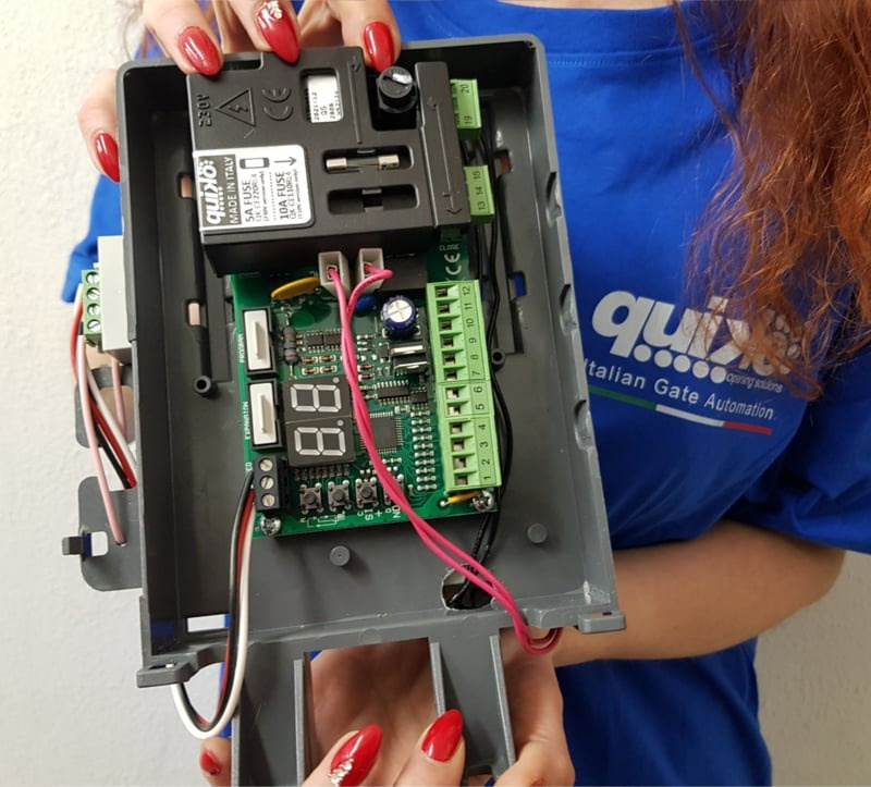 OverzichtQuiko QK-CE220BATRL2 besturingsprint voor schuifpoorten. . De print heeft een LCD-scherm voor het instellen alsmede feedback geeft (fout diagnose). Deze print is de opvolger voor de Proteco Q60S.