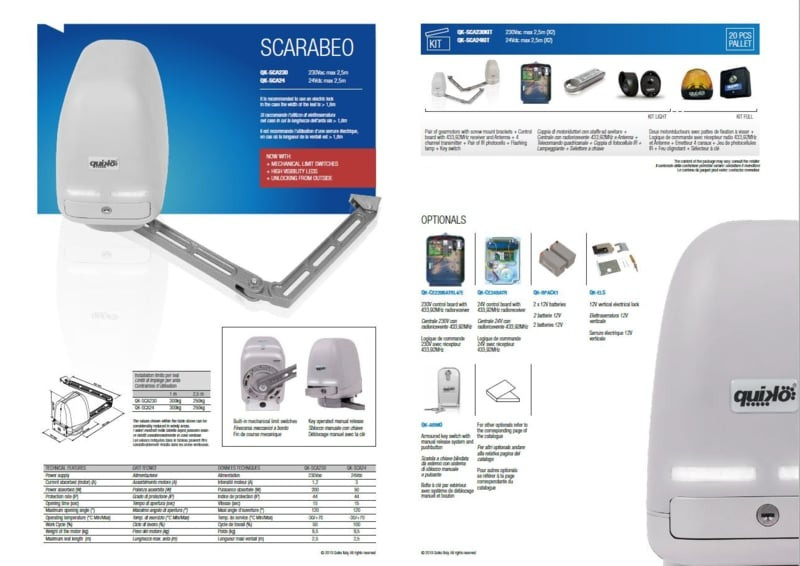 Deze knikarm poortopener is ontworpen voor intensief gebruik en is een kwalitatief hoogwaardig product in de professional serie. De Scarabeo is toepasbaar op bijvoorbeeld gemetselde penanten en garagedeuren. Twee sterke 230v motoren zorgen voor probleemloos openen en sluiten van uw poort of deur tot wel 250kg per motor en een vleugellengte van maximaal 2m. De Scarabeo is robuust en slijtvast wat voor een lange levensduur zorgt en is bovendien onderhoudsvrij. Daarom heeft u bij ons ook standaard 4 jaar garantie.