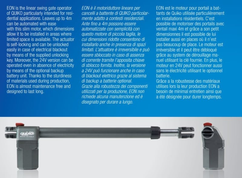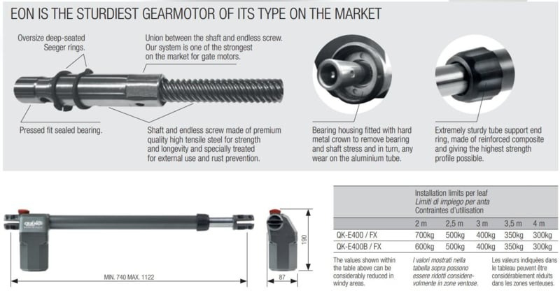 EON E400FX series is de snelste universele lineaire draaipoort opener van QUIKO op 230VAC, en voornamelijk ontworpen voor residentiële toepassingen. Draaipoorten met een gewicht tot maximaal 600 kg en maximaal 4 meter lang kunnen met de EON400FX probleemloos geautomatiseerd worden. Door een uitgekiend ontwerp kan de EON E400FX op een breed scala van poorten toegepast worden gaande van kleine, lichte houten poorten tot grote en zware stalen poorten. De actuator met spindel vervaardigt uit hoog kwaliteitsstaal is speciaal behandeld voor intensief gebruik buiten in alle weers- en klimatologische omstandigheden.