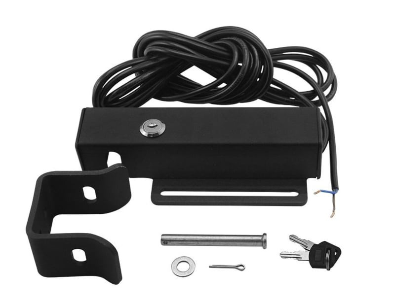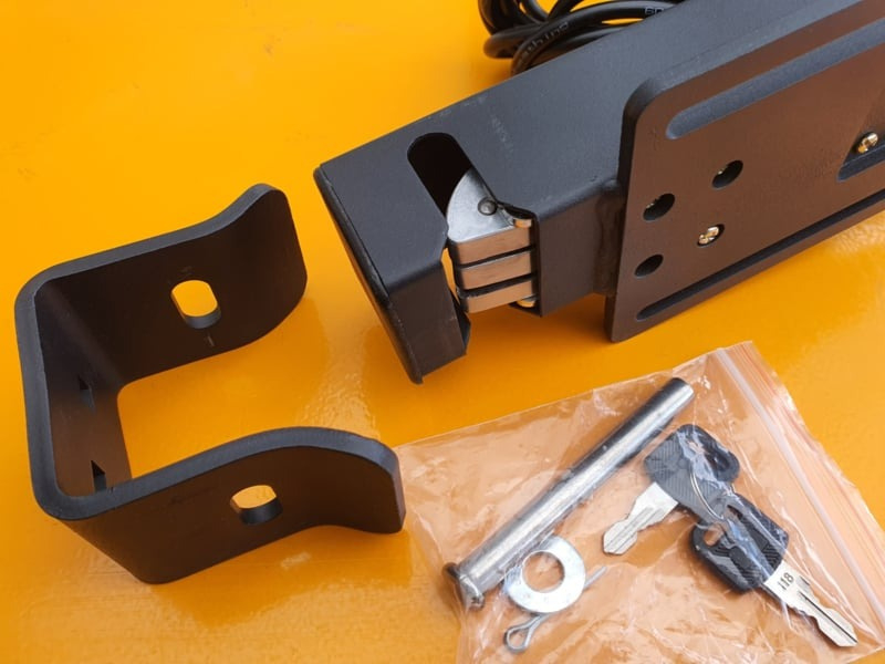Overzicht24v dc electroslot, tijdens sluiten van de poort is het slot spanningsvrij en valt over de pen, tijdens openen staat er spanning op het slot en de pen wordt ontgrendeld. Met slot om manueel te openen.