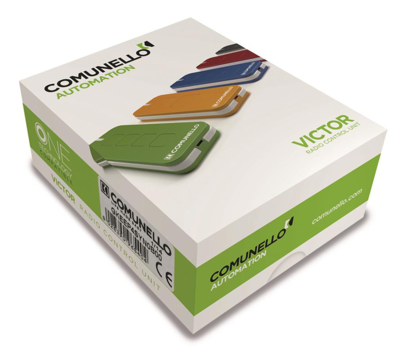 De 4-kanaals Victor zender heeft een frequentie van 433,92MHz en is gecodeerd met rolling code. Meer dan 18 miljoen combinatiemogelijkheden garanderen een maximaal veiligheidsniveau. De zender heeft een bereik van meer dan 100m in de open lucht en bestaat uit een voeding met één enkele 3VDC-batterij. Deze 4-kanaals uitvoering is beschikbaar voor meervoudig systeembeheer en is volledig compatibel met Comunello ontvangers.
