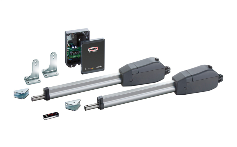 Sommer Twist 350 Rapido kit 2 motoren + Pearl Vibe zender Art nr. 105072 (SE)it met 2 elektromechanische aandrijvingen op 24 Vdc voor vleugelbreedtes tot 3000 mm, een besturing met inplugontvanger/repeater en 1 zender met 4 knoppen.