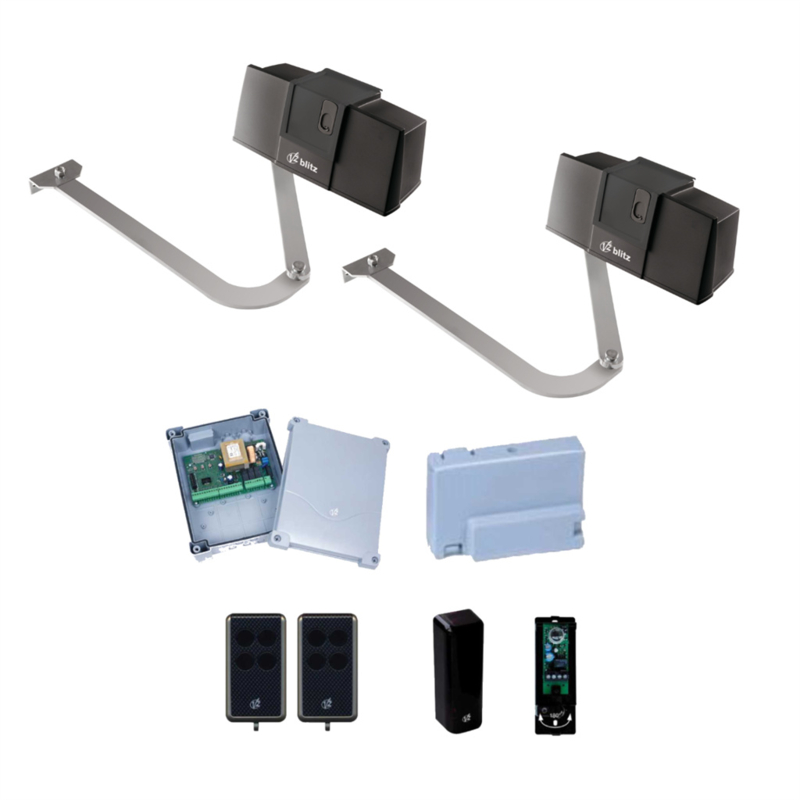 V2 Able Knikarm Kit BLITZ 230V. Art nr. KIT901 (NE)Kit met 2 electromechanische BLITZ motoren. Bestaande uit: 2 BLITZ motoren, stuurkast STU830, ontvanger PAP015, 1 paar fotocellen FOT280 en 2x 4-kanaals zenders PAP604.
