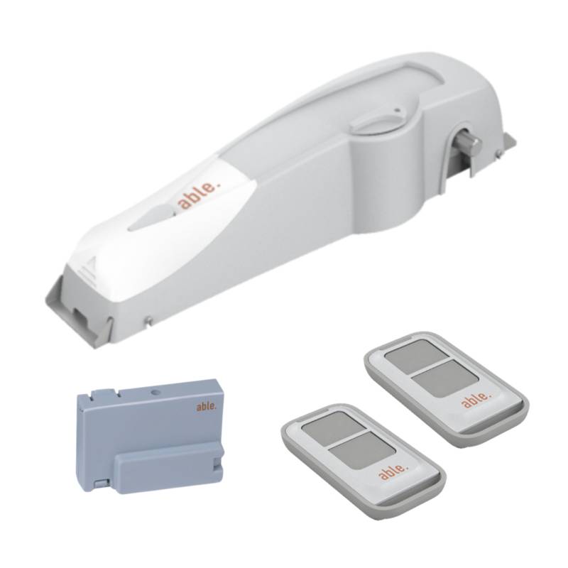 ABLE - Kit DD-SMALL 9000D motor met ontvanger en 2 2kanaals zenders . Art nr. ABLE-KL-DD-SMALL 9000D 230 (NE)KIT bestaande uit : 1 ABLE-DD-S9000D 230V actuator, 1 ABLE-RX-MR-433 RX-MR ontvanger en 2 ABLE-TX-TOH2-433C 2-kanaals TX-TOH zenders. Leert de tijden automatisch en verstelbare eindelopen. 1 fotocell input met zelf-test functie.ā¦